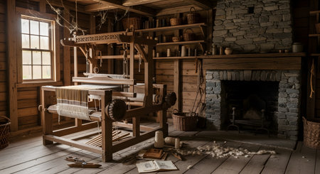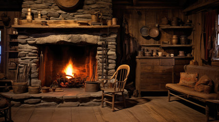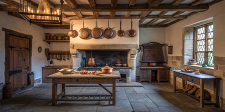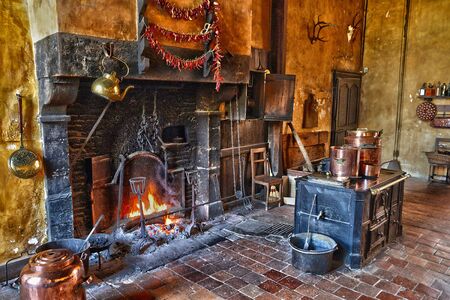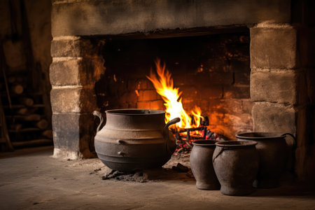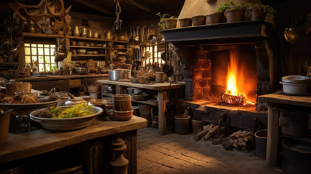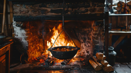 A rustic kitchen scene showcasing traditional cookware and a warm fire, inviting a sense of home and history. Perfect for culinary inspiration and lifestyle themes.