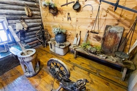Samara region, Russia - May 11, 2019: Vintage wooden house utensils in rural home. Interior of the house museum of famous painter Ilya Repin in Shiryaevo village