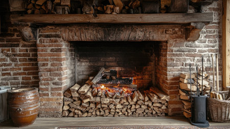 Rustic fireplace background with stacked firewood and a brick mantle, offering a cozy, country-style setting.cc31d