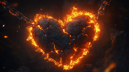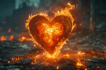 heart engulfed in flames, radiating intense heat and light, stands against a backdrop of swirling smoke and embers.