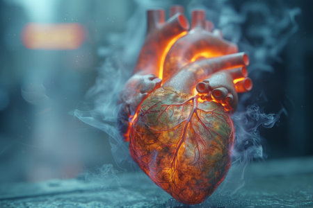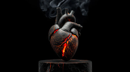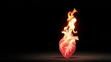 A digital illustration presents a human heart engulfed in flames against a stark black background. The artwork features vibrant red and orange hues, with glowing textures and soft lighting effects. This visual composition could be used for themes related to health, passion, or emotional concepts suitable for various editorial and commercial applications.