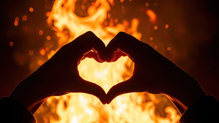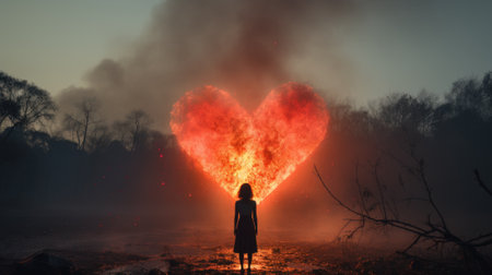 A woman standing in front of a heart shaped fire. Generative AI image.