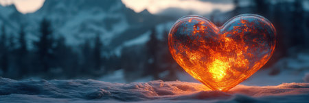 Fiery heart rests on snowy ground near a mountain range at dusk