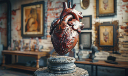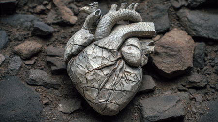 The sculpture of a human heart showcases intricate details, resting on a textured rocky surface.