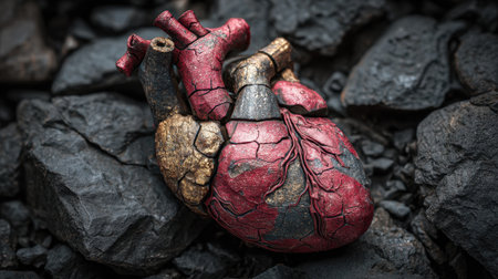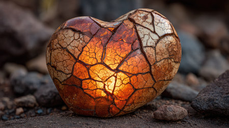 An artistic representation features a heart shape with a cracked texture, illuminated by a warm, internal light. The composition highlights earth tones and contrasts between light and shadow. Suitable for design projects, this image may be used for various commercial and editorial applications, emphasizing concepts like vulnerability and resilience.