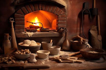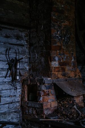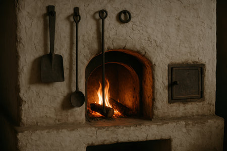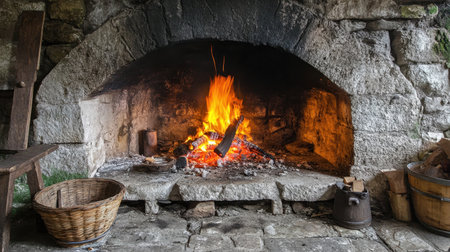 Traditional rustic wood burning oven with open fire, old tools hanging on wall, cozy rural interior ambiance.