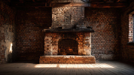 Rustic brick indoor fireplace without logs, completely empty inside, photographed with natural light and soft shadows