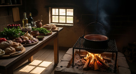A dimly lit, rustic kitchen features a table laden with fresh produce and bread, with a pot simmering over an open fire.