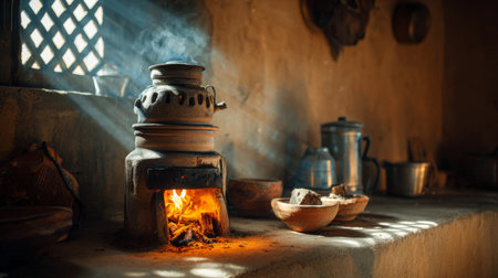 A serene kitchen scene showcasing a vintage stove emitting smoke, illuminated by soft sunlight. The composition reflects warmth, tradition, and simplicity in a rustic setting.