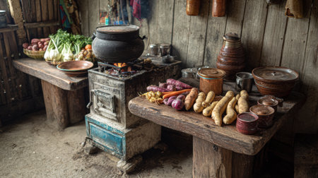 Inviting rustic kitchen setting featuring wooden tables laden with fresh vegetables and a warming pot on the stove, perfect for capturing the essence of culinary traditions.