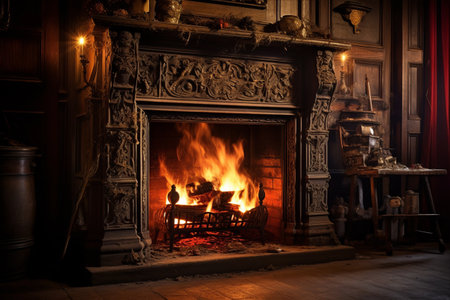 Cozy fireplace with glowing logs and sparks creating a warm atmosphere in a rustic home setting on a chilly evening