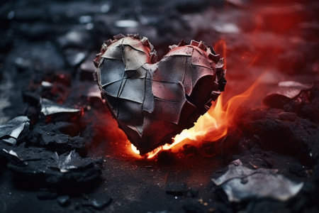Close up of dark red coals and burnt paper forming a heart shape symbolizing broken hearts and relat
