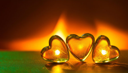 A close-up of three glass hearts, each with a different color, illuminated by a warm orange flame. The hearts are set on a surface covered in iridescent glitter. Out of focus lights blur in the background.