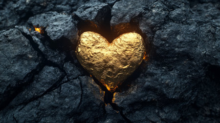Golden heart emerging from a dark, cracked lava rock, symbol of generative strength ai