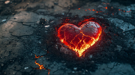 Fiery red heart emerging from a dark, cracked ground, representing passion. generative ai