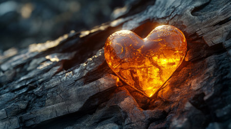 Glowing amber heart nestled in cracked wood, concept of resilience and regrowth generative ai