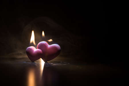 Valentines background. Valentine's Day heart on a dark wooden table. Burning hearts. Heart in fire. Dark toned foggy background. Selective focus