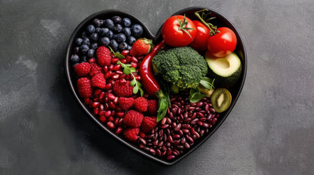 Fresh fruits and vegetables arranged heart shaped bowl, showcasing variety of colors and textures. This vibrant display includes blueberries, tomatoes, broccoli, and more, promoting healthy eating