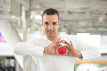 Man in black t-shirt holding red heart in his hand, copy space for text and isolated on white background