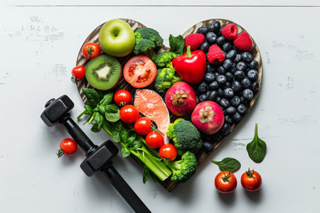Vibrant red heart symbolizing love and health is placed in foreground, surrounded by fresh fruits like lemons, apples, and berries. This conveys sense of wellness and vitality