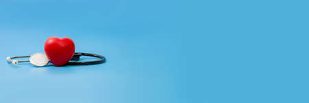 Stethoscope and heart examination red on blue background, healthcare concept.