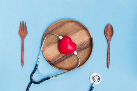 Red heart and stethoscope on wood plate with knife and fork. Diet or healthy eating concept.