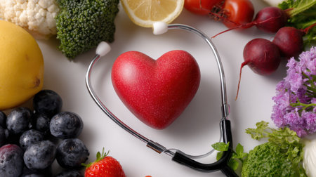 Explore the vibrant relationship between heart health and nutrition with this visually striking image featuring fresh produce and a stethoscope.