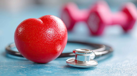 This image features a heart symbol alongside a stethoscope and dumbbells, exemplifying the connection between fitness and cardiovascular health, perfect for wellness themes.