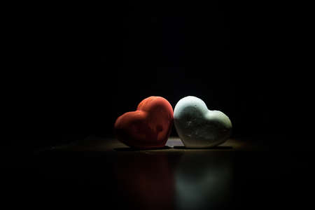 Top view of red and white wooden handcraft heart symbol on black background. Dark,elegance and luxury backdrop. Valentine's day theme.