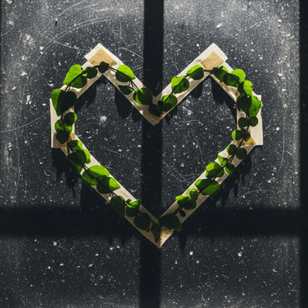 Macro detail of a heart outline made from dusty greenery taped to a scratched window pane in harsh s