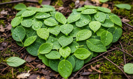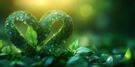 A heart shape made of lush green leaves, symbolizing love for nature and the environment. The leaves are covered in tiny water droplets, enhancing their vibrant green color.