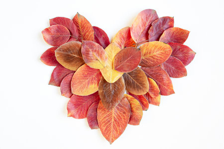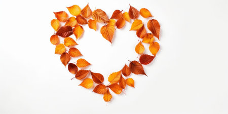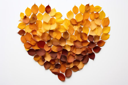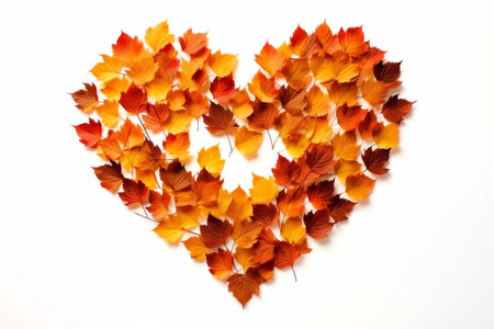 An AI generated illustration of a heart-shaped collage of autumnal orange and red leaves on a white background