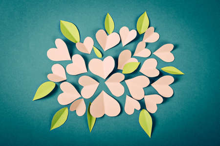 Heart shaped green leaves, Heart symbol in green leaves, earth day, loving nature background. top view. creative eco friendly concept advertising