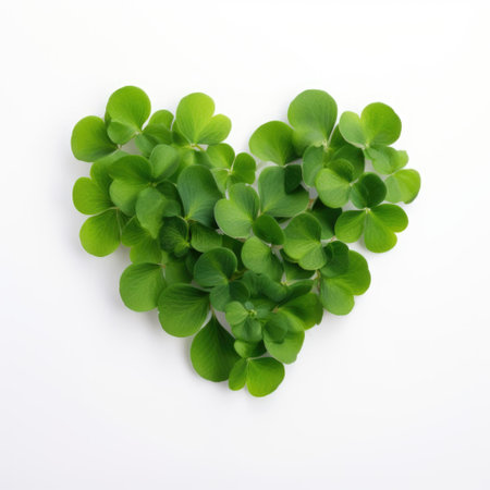 Green clover leaves set out in the form of heart on white background. St. Patrick's day vacation and holiday clovers symbol. High resolution photo. Full depth of field.