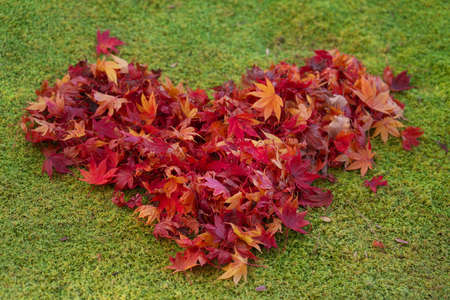 Kyoto,Japan-November 18,2020: Heart-shaped autumn leaves stacked on moss