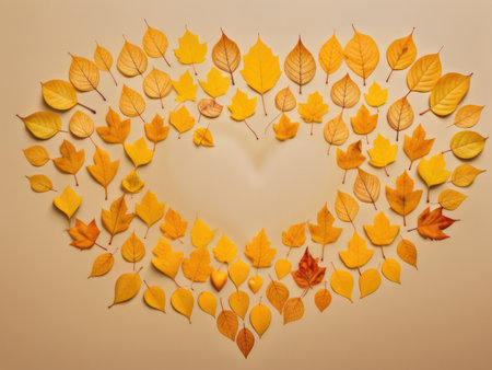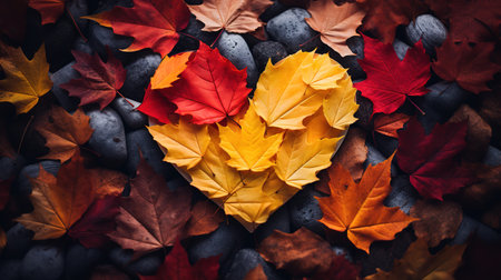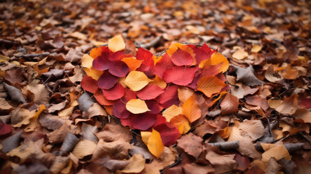Beauty of autumn with a fall foliage background. Heart shape. A vibrant palette of colorful leaves. Generative AI
