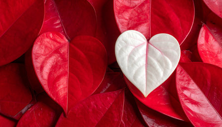 Red and white heart-shaped leaves on red background. Valentine's day background.