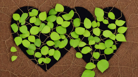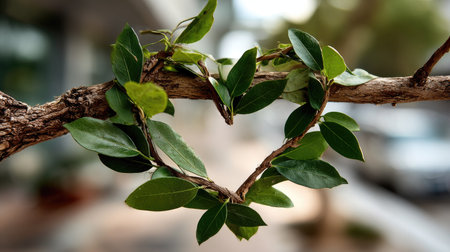 A beautifully arranged heart shape created from vibrant green leaves on a rustic branch, symbolizing love and nature. Perfect for representing harmony.