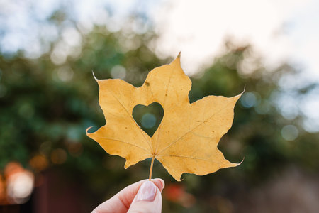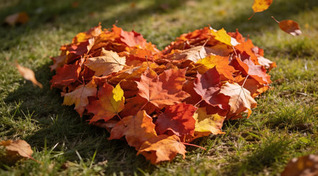 Heart-shaped autumn leaves backlit by the golden sun, creating a warm glow. Symbolizing nature's beauty, love, fall season, and warm sentiments. Evoking peace, serenity, and connection with natural world.