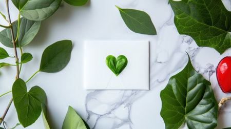 An artistic arrangement featuring a heart shape crafted from fresh green leaves placed on a marble background, surrounded by diverse foliage, conveying love and nature.