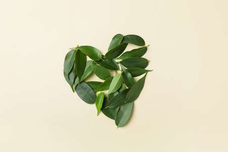A heart shape formed with natural green leaves, displayed on a pale beige background.