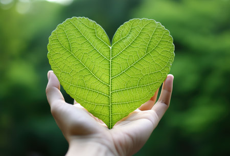 A human hand tenderly holding a bright green leaf in the shape of a heart, symbolizing love for nature and environmental protection.
