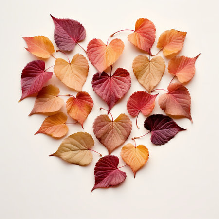 A heart shape created with a variety of colorful autumn leaves displaying shades of pink red yellow and green on a light surface. This arrangement showcases the beauty of fall foliage.