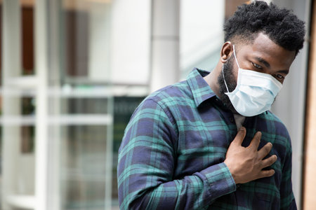 Covid-19 chest pain as infection symptom, man with respiratory mask holding a hand at his chest