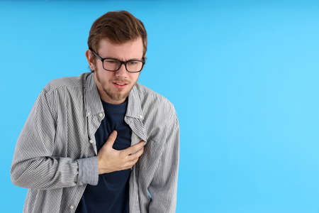 Young Asian man wearing suffer from chest pain. Close up body portrait agains blue wall