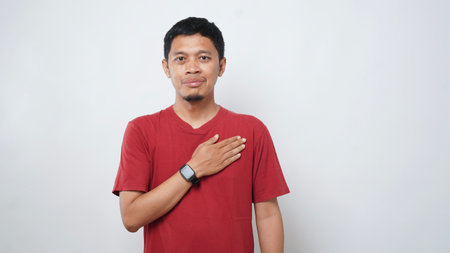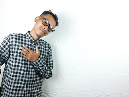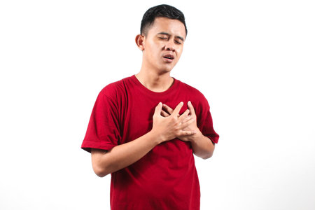 Close up photo of asian man feeling suffering and using hand for touching on chest for checking about his heart attack symptom , mental health care concept