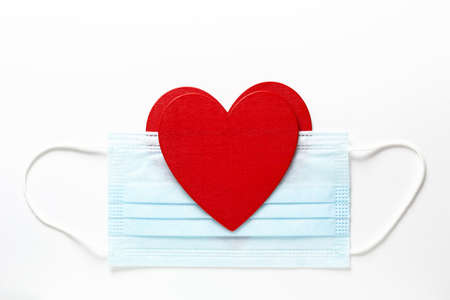 Medical and concept of Saint Valentine Day, red heart symbol with medicine protection mask on white