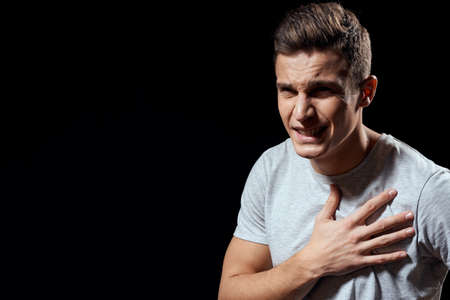 A man in a white T-shirt holds his hand on his heart. The light flashes in time with the heartbeat. Signs of stroke and heart disease.