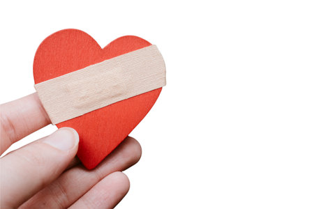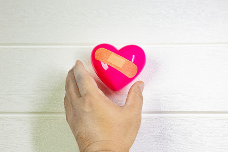 Wounded heart with bandage on the wooden background. Difficult love concept