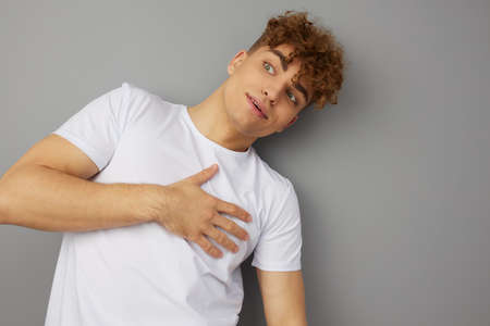 a relaxed, curly-haired young man in a white cotton T-shirt stands on a gray isolated background holding his heart with his hand. Horizontal photo for inserting an advertising layout